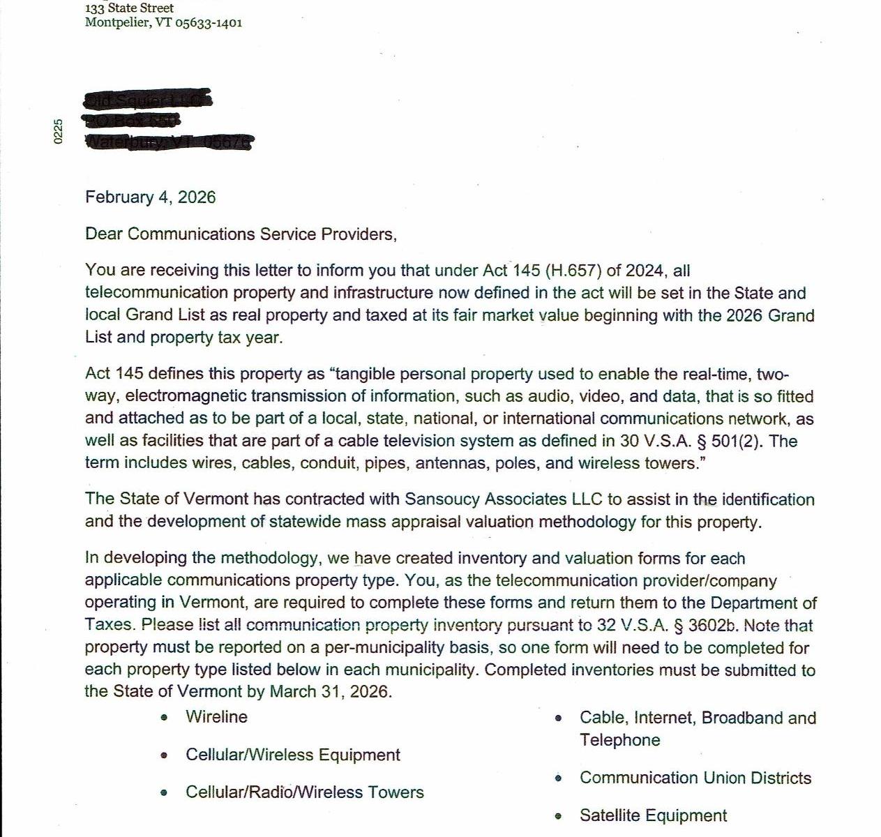 It was brought to the VAB’s attention on Friday, February 13th that some stations had received a letter in the mail from the Vermont Department of Taxes informing them of a new state tax on telecom property passed in Act 145 that their station is supposedly subject to.