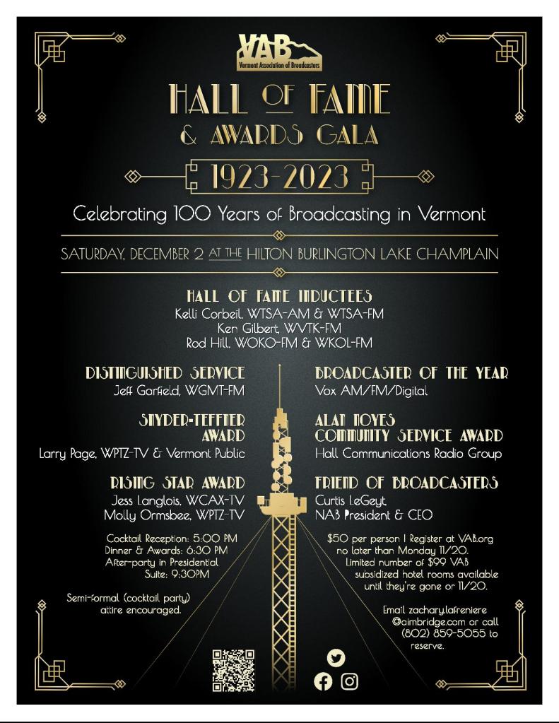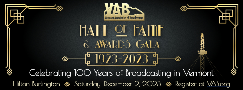 1923-2023; Celebrating 100 Years of Broadcasting in Vermont during the 28th Anniversary of the VAB Hall of Fame & Awards Gala Saturday, December 2, 2023 at the Hilton Hotel, 60 Battery Street in Burlington!